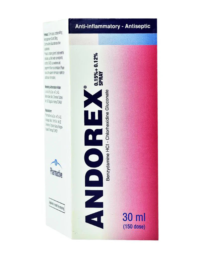 Andorex 0.15% + 0.12% është një spray që përdoret për trajtimin e inflamacionit në mukozën e gojës dhe të fytit.