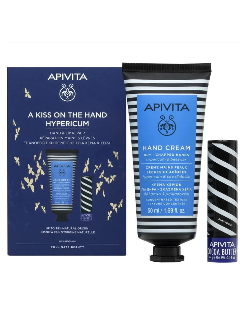 Apivita A Kiss On The Hand Hypericum, një dyshe e përshtatshme për ju ose të dashurit tuaj në një kuti dhuratash festive që përmban dy gjëra të domosdoshme për riparimin dhe mbrojtjen e duarve dhe buzëve.