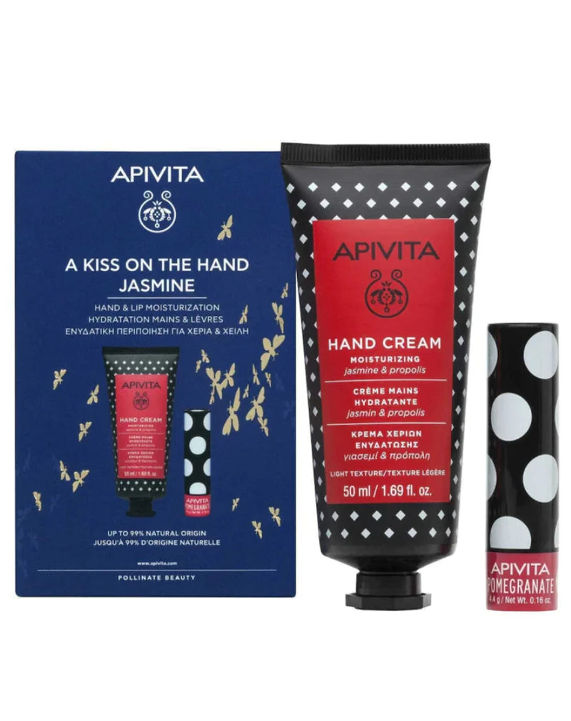 Apivita A Kiss On The Hand Jasemin, një dyshe e përshtatshme për ju ose të dashurit tuaj në një kuti dhuratash festive që përmban dy gjëra të domosdoshme për riparimin dhe mbrojtjen e duarve dhe buzëve.