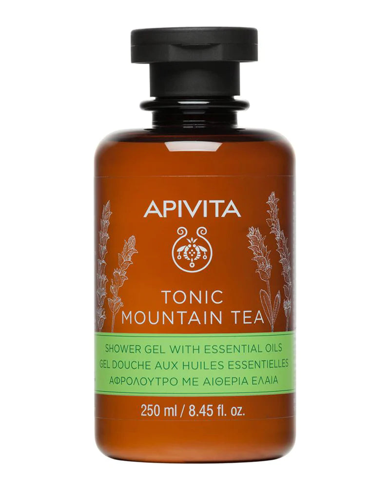 Apivita Tonic Mountain Tea Shower Gel, xhel dushi me vajra esencialë, i frymëzuar nga aromaterapia, pastron butësisht lëkurën pa e dehidratuar dhe duke e mbrojtur nga stresi oksidativ falë çajit nga malet greke.