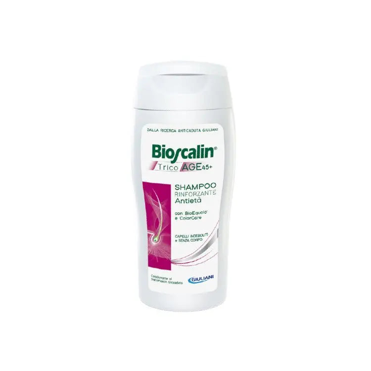 Bioscalin ® TricoAGE 45+ Anti-aging shampo është një shampo forcuese e indikuar specifikisht në rastet e hollimit të flokëve tek femrat. Në menopauzë dhe në periudhën pas, ndryshimet hormonale mund të ndikojnë në mirëqënien e flokëve, që gradualisht humbin densitetin, fortësinë dhe shkëlqimin.