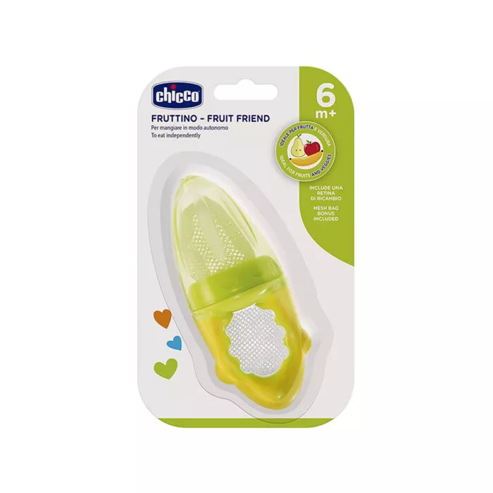 Chicco Fruttino, mbajtëse frutash me një rrjetë të përfshirë, ka një dorezë të butë dhe të përshtatshme, ideale për duart e fëmijëve të vegjël 6 muaj e lart. E përshtatshme për të zbuluar dhe shijuar në mënyrë të sigurt shije dhe tekstura të reja, duke lejuar kalimin përmes rrjetës vetëm të copëzave më të vogla të frutave.