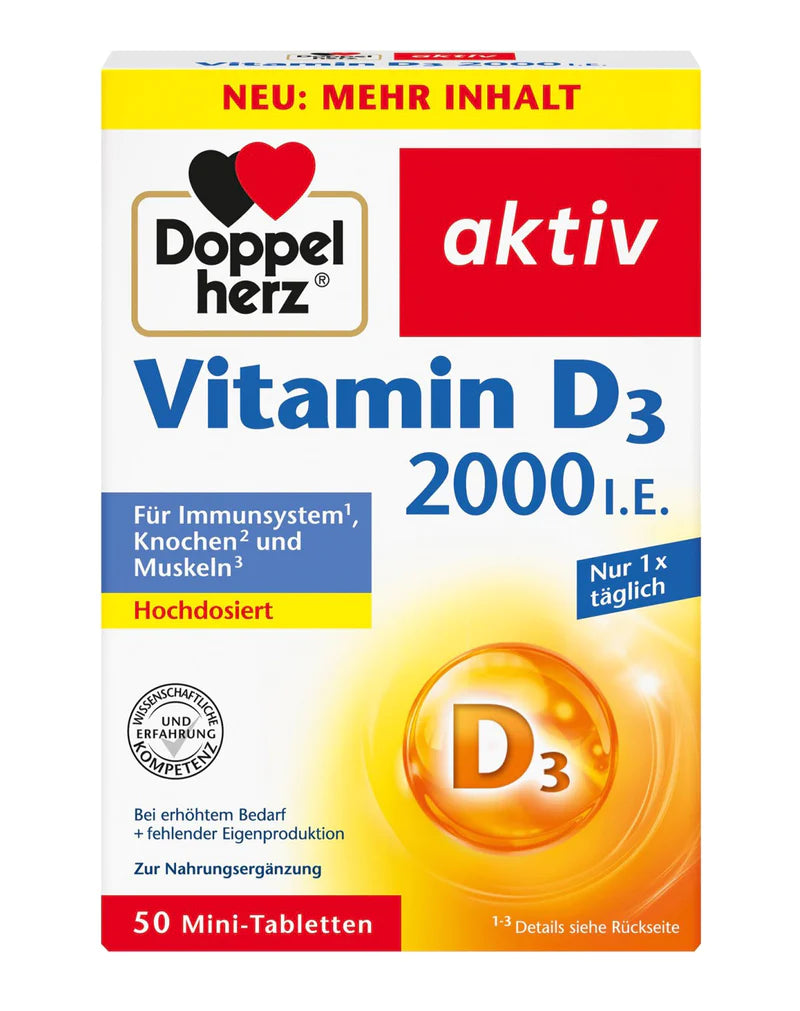 Tabletat Doppelherz përmbajnë 50 μg vitaminë D. Kjo korrespondon me 2000 IU (njësi ndërkombëtare) të vitaminës D.Dihet prej kohësh që vitamina D kontribuon në mirëmbajtjen normale të kockave si “ndërtues i kalciumit”. Sot ne e dimë që vitamina D gjithashtu përmbush detyra të tjera të rëndësishme në trup.