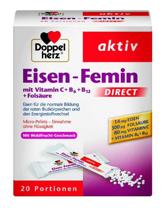 Doppelherz Eisen-Femin DIRECT përmban 14 mg hekur, një kombinim i acidit folik, vitaminave B6, B12 dhe vitaminës C.
