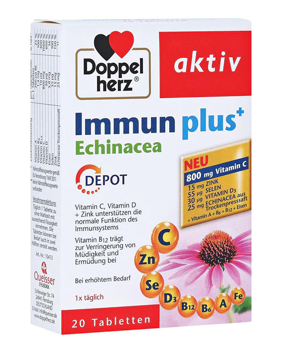 Tabletat Immun plus Echinacea Depot nga Doppelherz përmbajnë 5 vitamina të vlefshme si dhe tre elementët gjurmë zink, hekur dhe selen. Gjithashtu përfshihet 25 mg ekstrakt nga bima e ekinaceas.