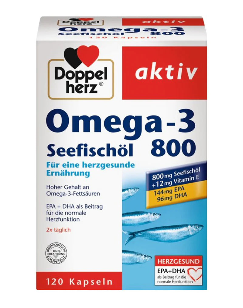 Kapsulat aktive të vajit të peshkut të detit Omega-3 800 mg nga Doppelherz përmbajnë vaj peshku deti, i cili përbëhet nga 30% të acideve yndyrore omega-3 EPA dhe DHA, të cilat kontribuojnë në funksionimin normal të zemrës.