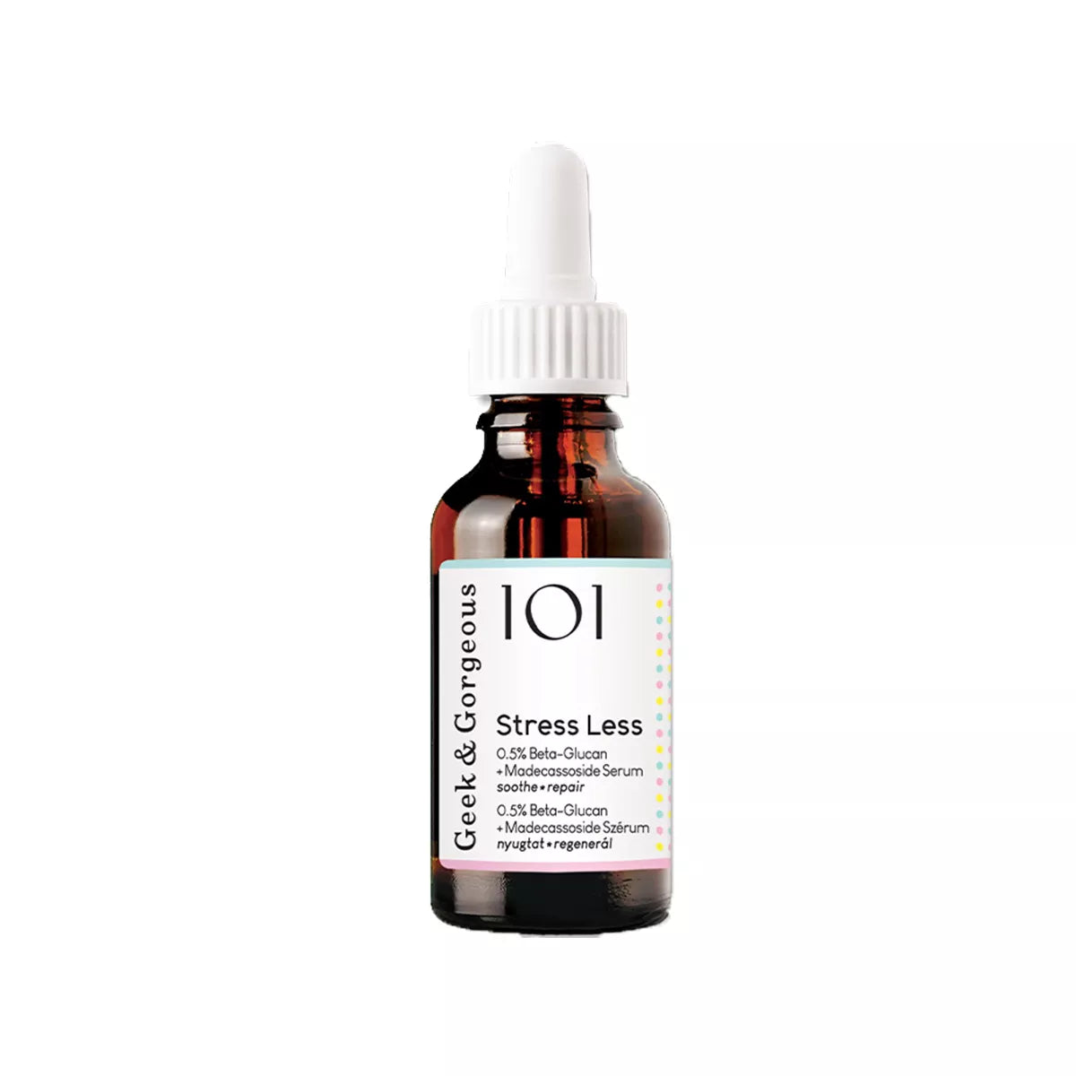 Stress Less është krijuar të përmirësoj lëkurën e ndjeshme, të demtuar, të irrituar, të dehidratuar, duke kombinuar 2 super molekula me veti të njohura qetësuese, hidratuese dhe riparuese sic janë Beta-Glukan dhe Madecassoside.