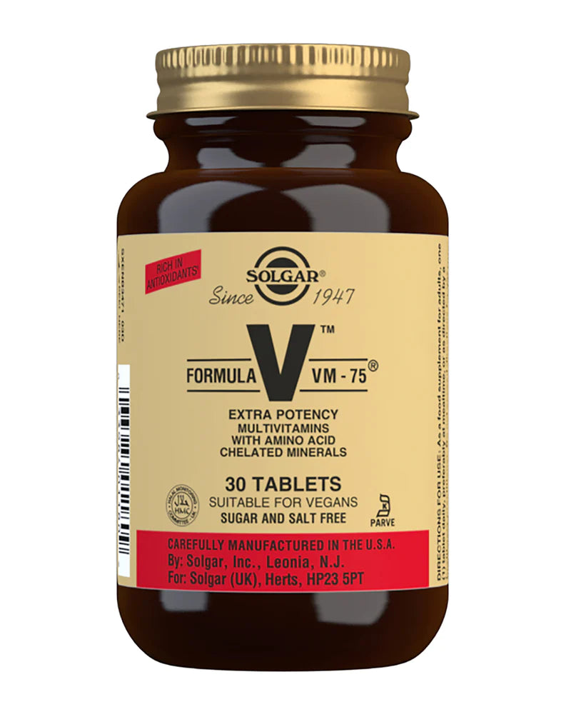 Solgar Formula VM-75, formulë komplekse me vitamina, minerale, antioksidantë, baza bimore në formë pluhuri (lucernë, acerolë, majdanoz, lakrishtë, kaçë) dhe bioflavonoide në vetëm një tabletë në ditë.